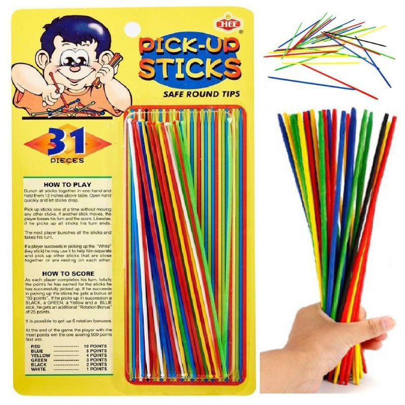 Pick-up sticks or pick-a-stick is a game of physical and mental skill in which a bundle of "sticks", between 8 and 20 centimeters long, are dropped as a loose bunch onto a table top, jumbling into a random pile. Each player in turn tries to remove a stick from the pile without disturbing any of the others.