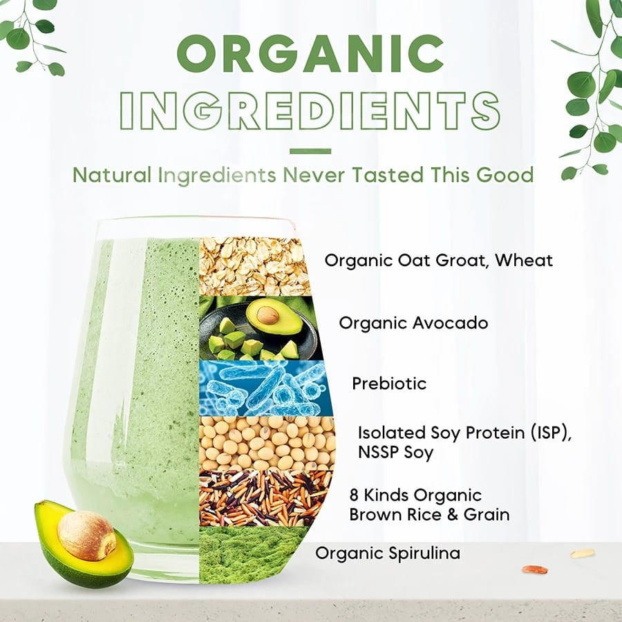 Avocado, Spirulina, Organic Brown Rice, Organic Red Rice, Organic Quinoa, Organic Millet, Organic Black Rice, Organic Barley, Organic Oat Groat, Wheat, Non-GMO Corn, Organic Mung Bean, Organic Rye Grain, Isolated Soy Protein (ISP), NSSP Soy, Prebiotic, Calcium